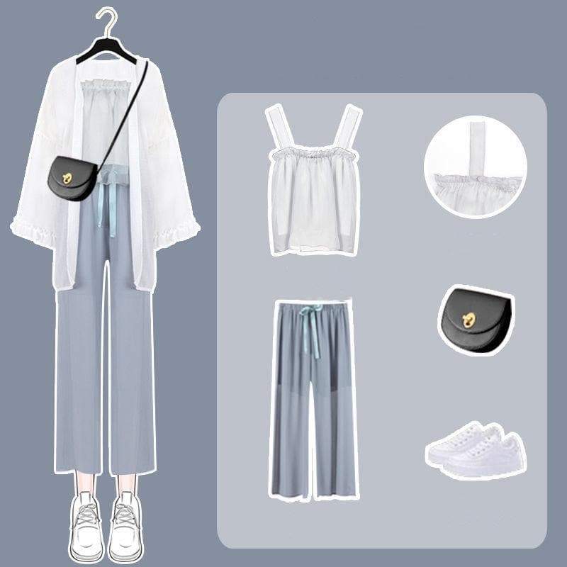 Spring/Summer Comfy Casual Fashion White Top and Blue Pants Set SP16115
