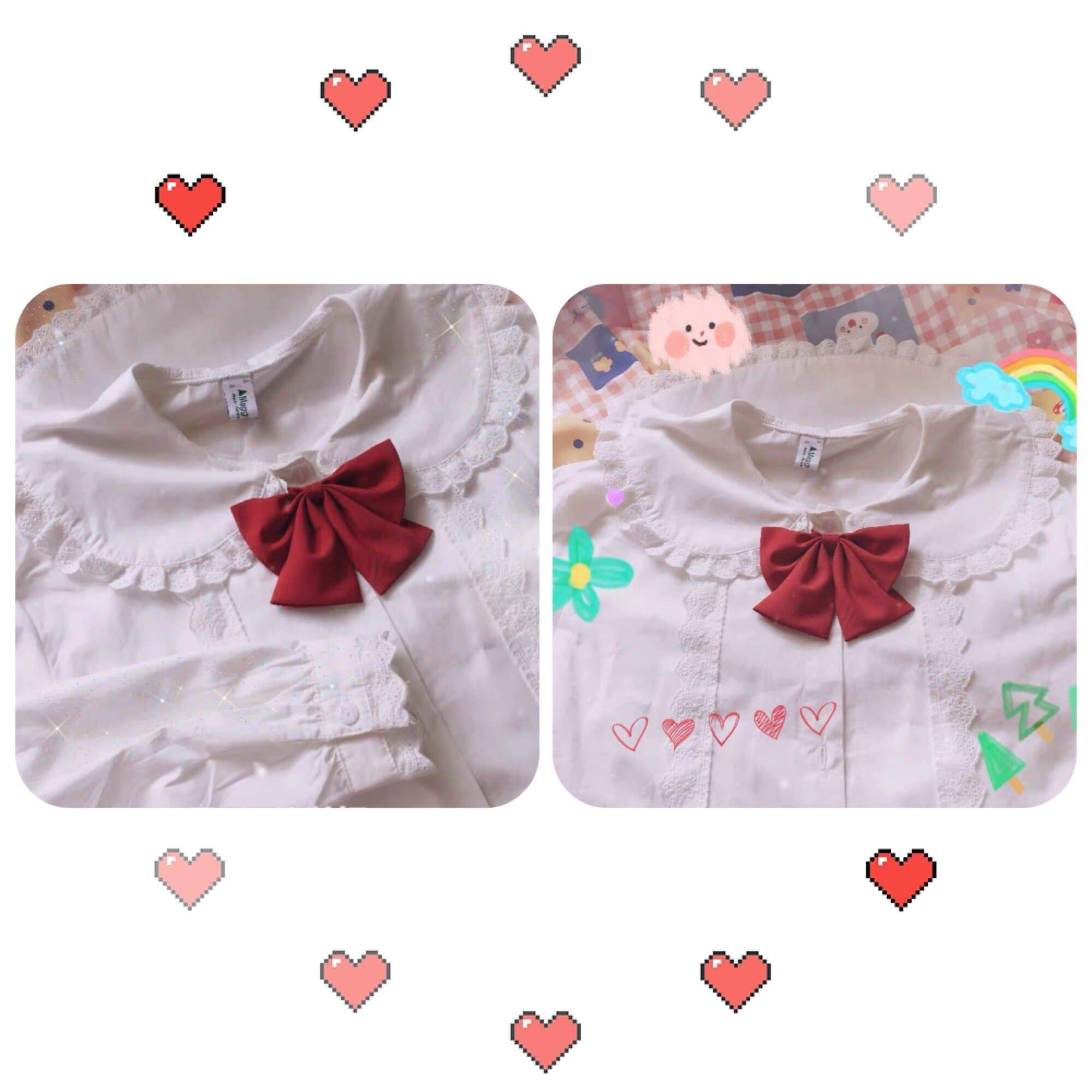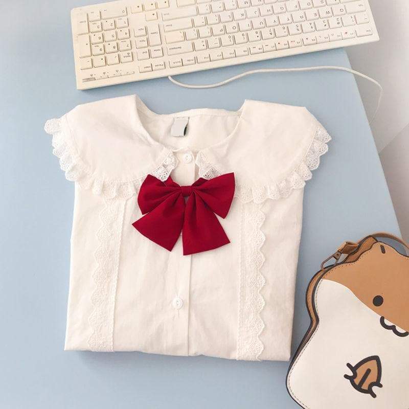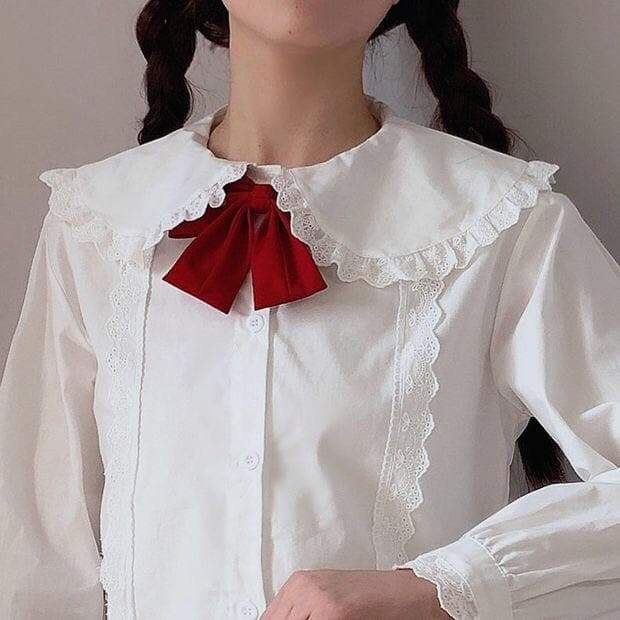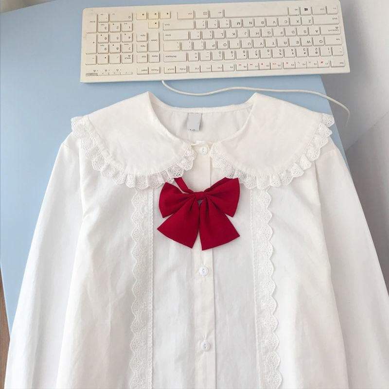White Peter Pan Collar Kawaii Long sleeve Lolita Shirt with bow and lace decoration. Shirt without red bow is also available for purchase.