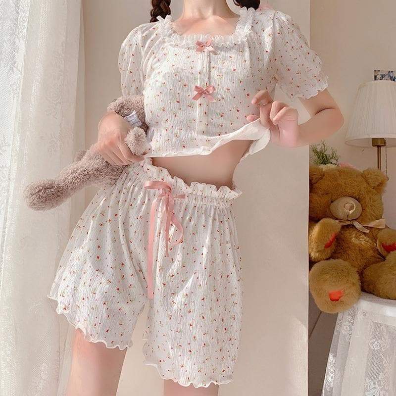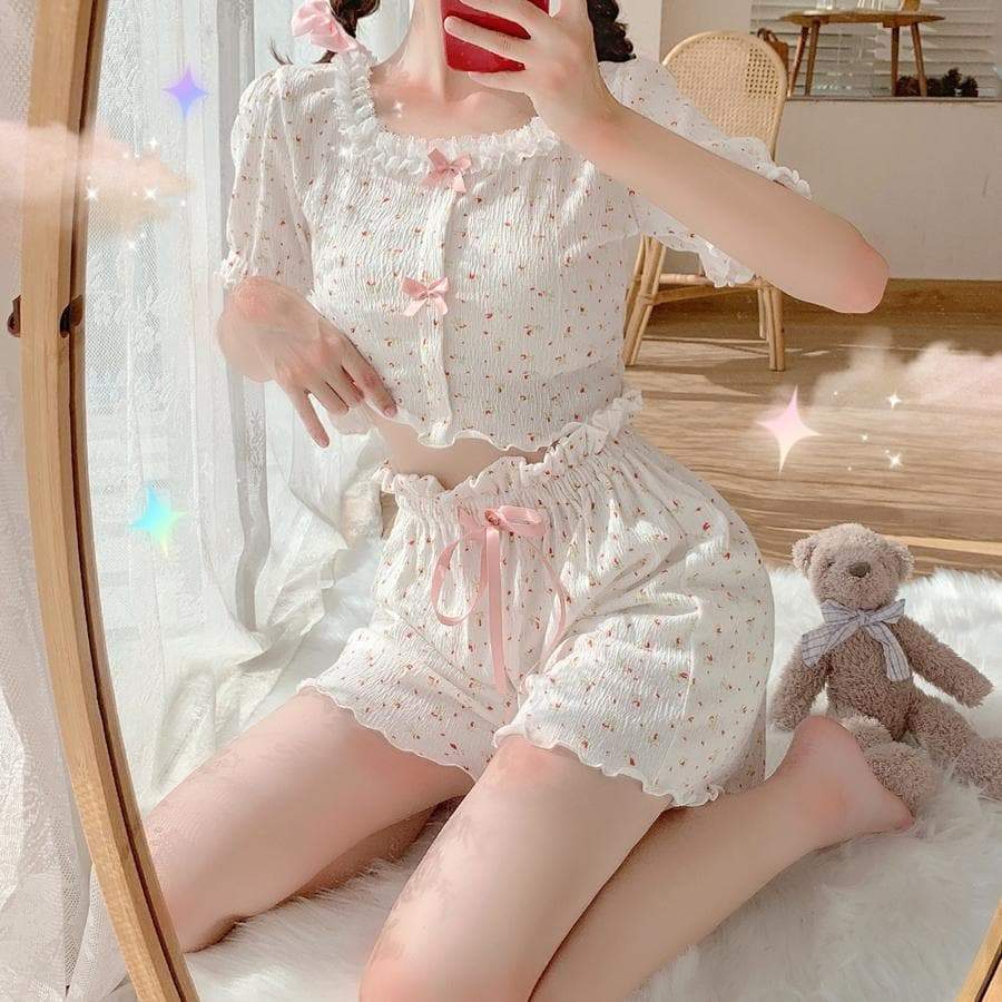 Sweet Kawaii Cute Lace Floral Two Piece Pajamas Homewear Set SP16184