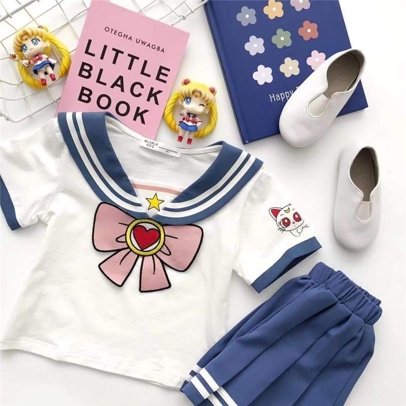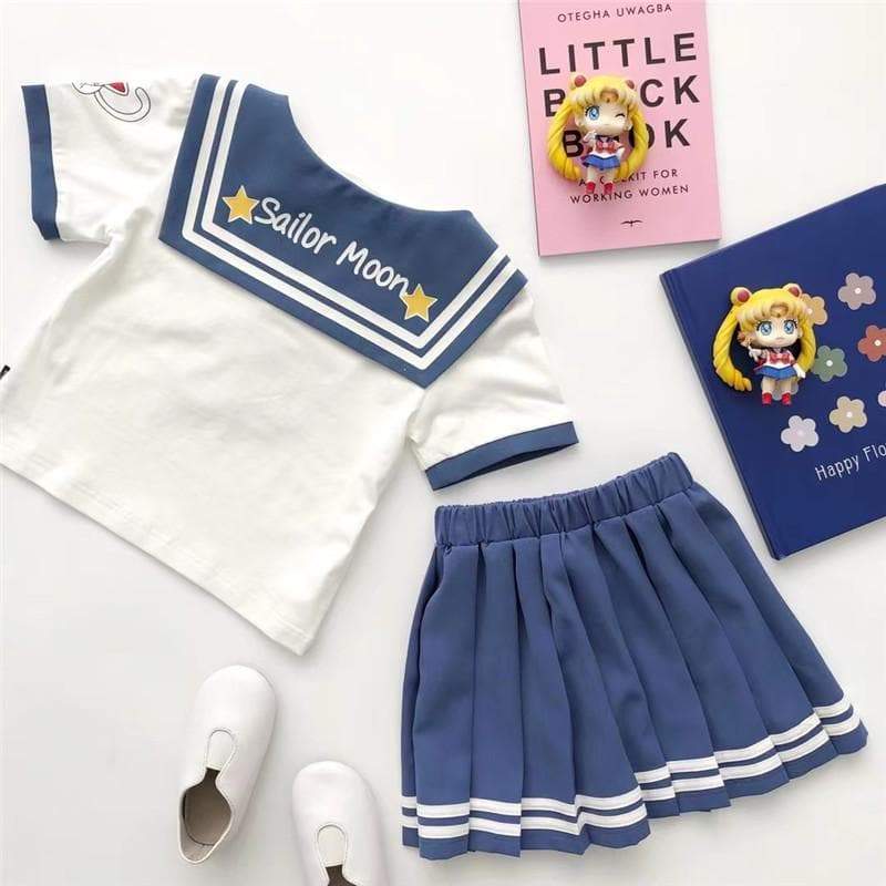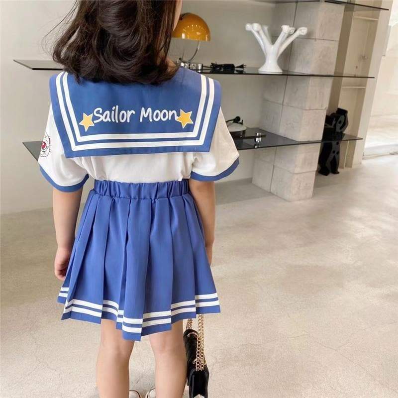 Cute Sailor Moon Bow Striped Tops Pleated Skirts Children Clothes Set SP16210