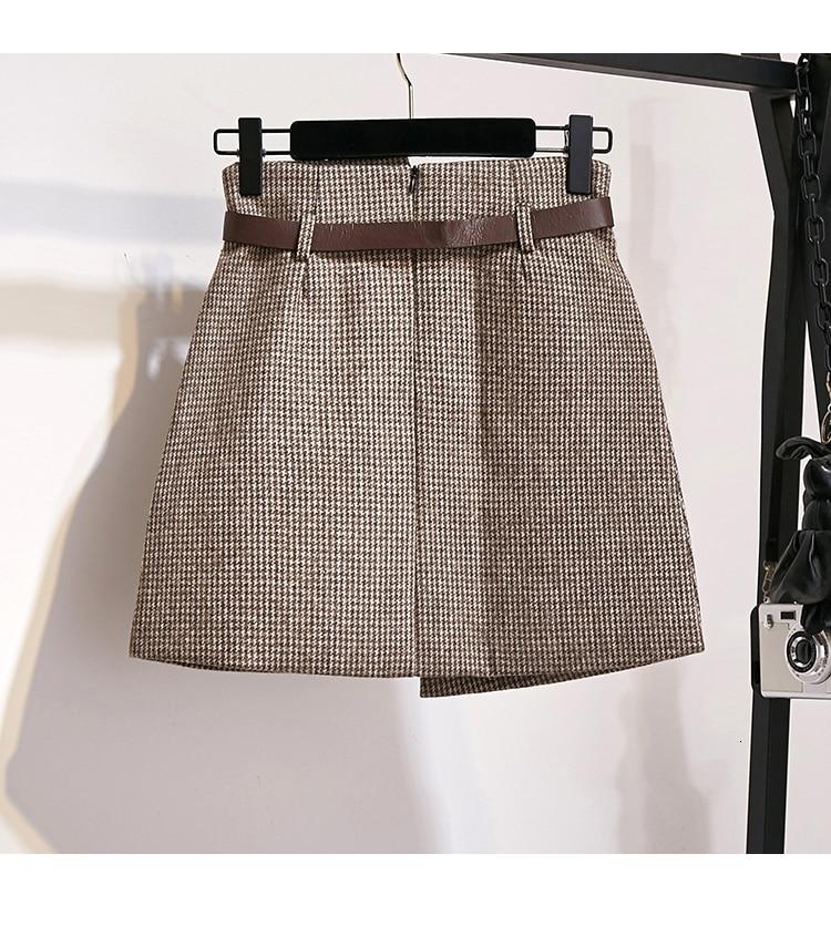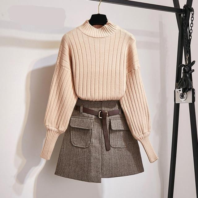 Korean Fashion Knitted Puff Sweater and Woolen Plaid Skirt Set SS2118