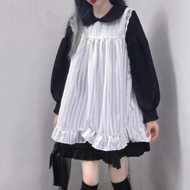 2-Piece Kawaii Aesthetic Pink Lolita Dolly Ruffle Dress Set featuring pink babydoll long sleeve dress with peter pan collar and a white sleeveless ruffle semi-sheer top dress.
