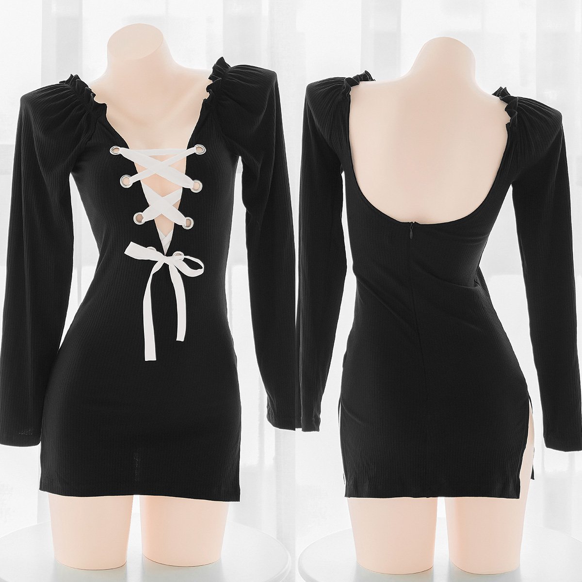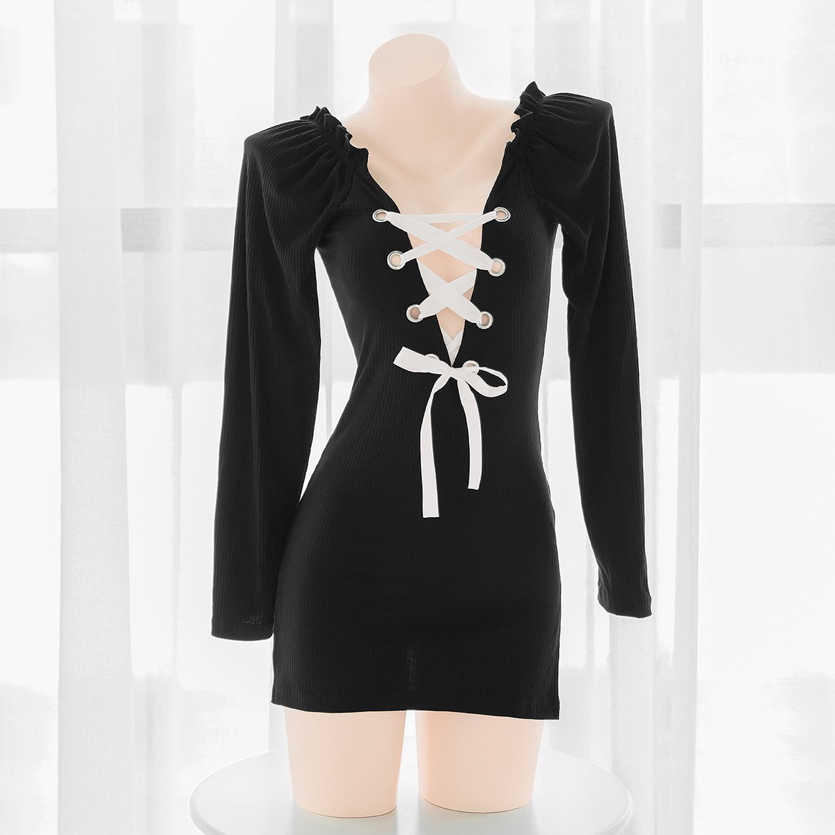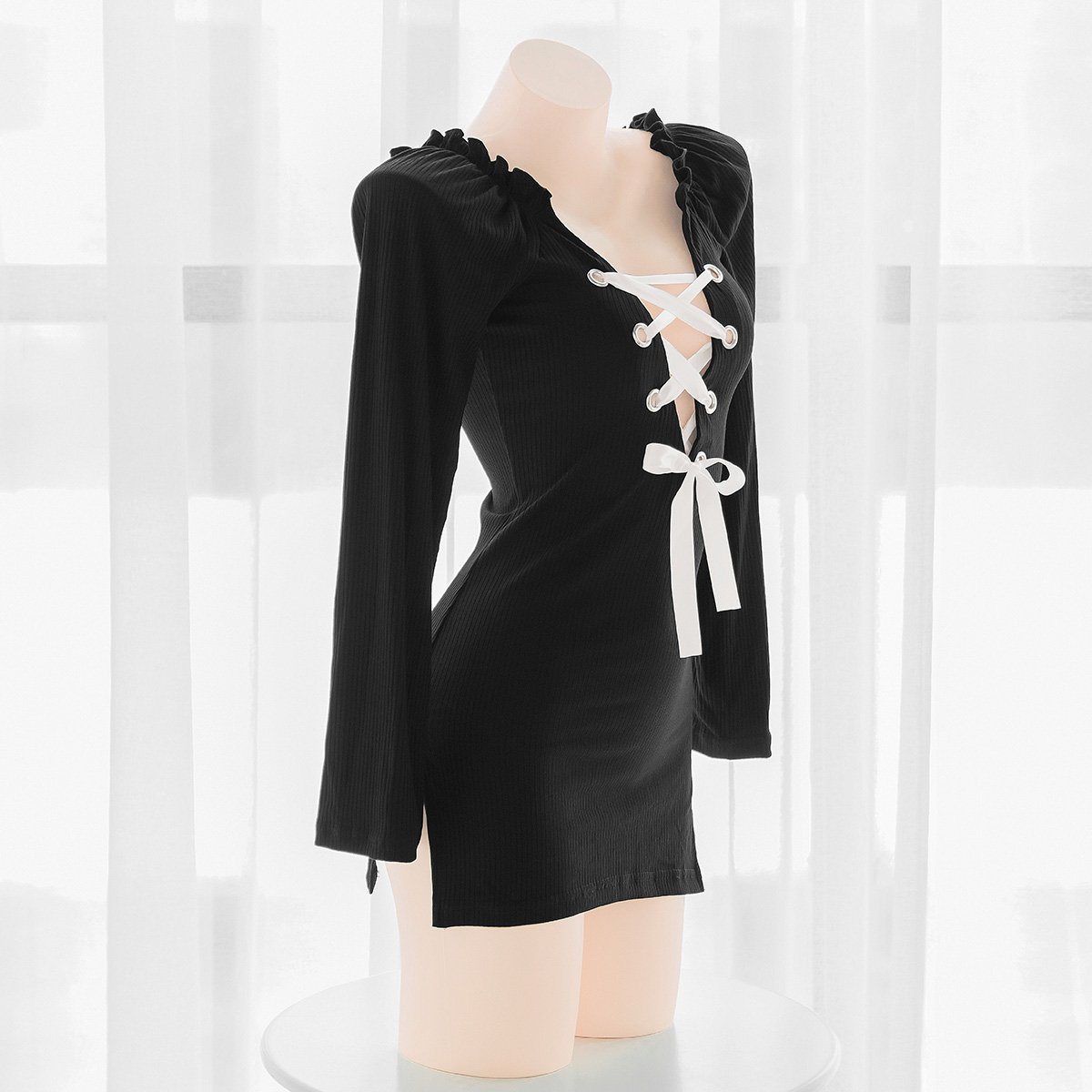 Cute White Ribbon Tie Up Black Lingerie Dress SS2109