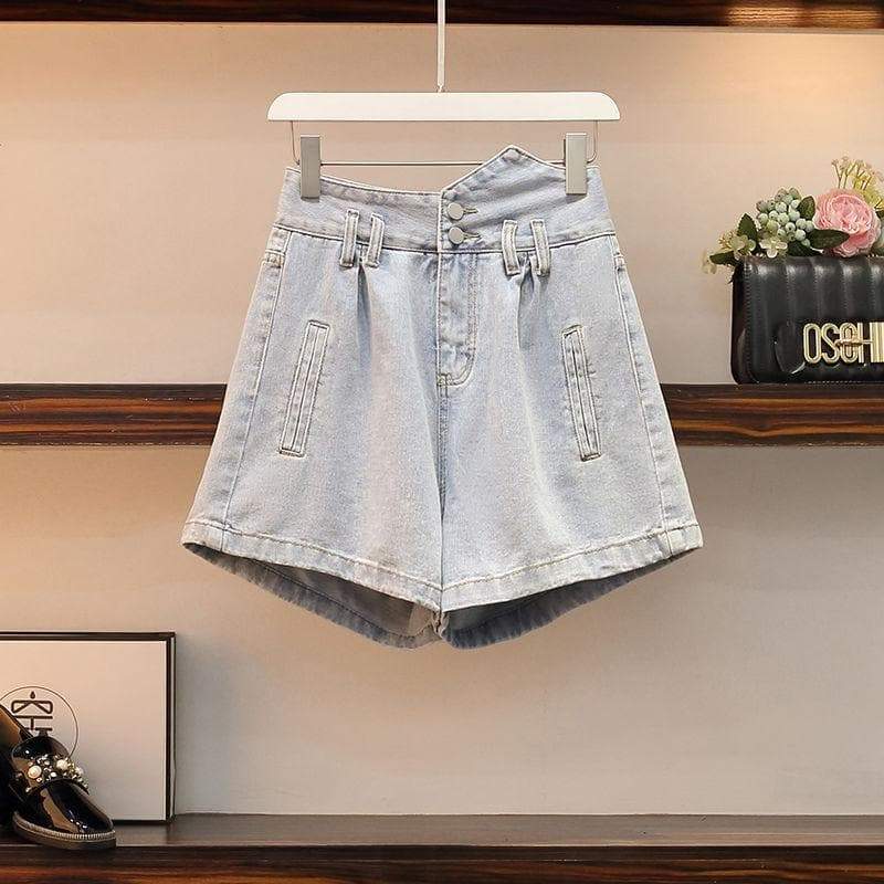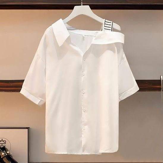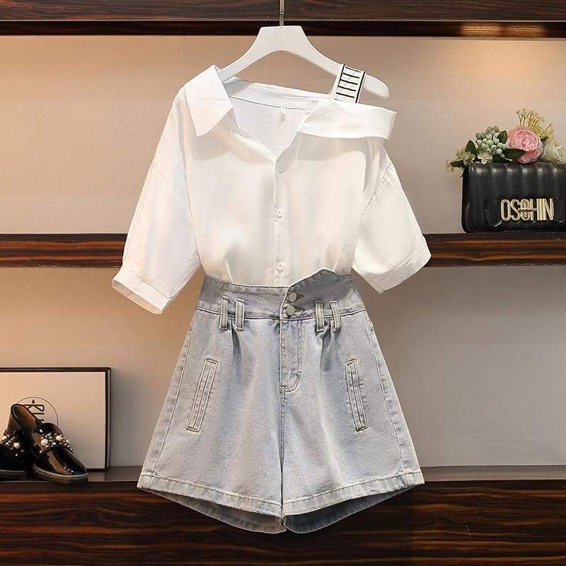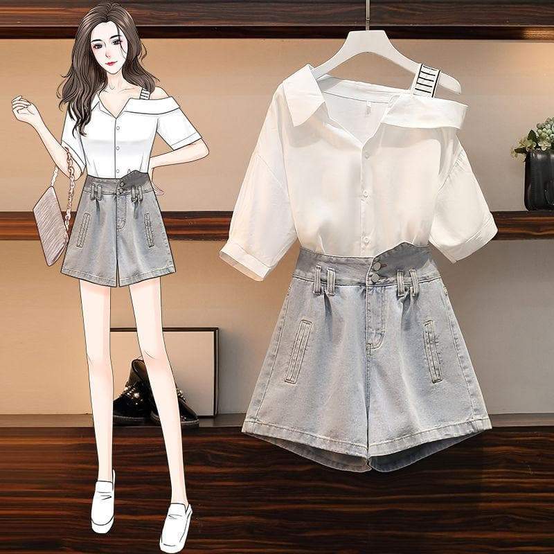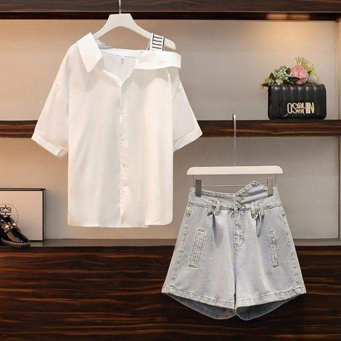 Cute Casual Irregular of the Shoulder White Shirt and Denim Shorts Set SS1305