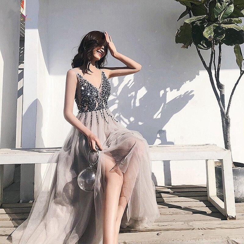 Gray Prom Dresses Tulle Sleeveless Sequins Long Evening Gowns SS1828
