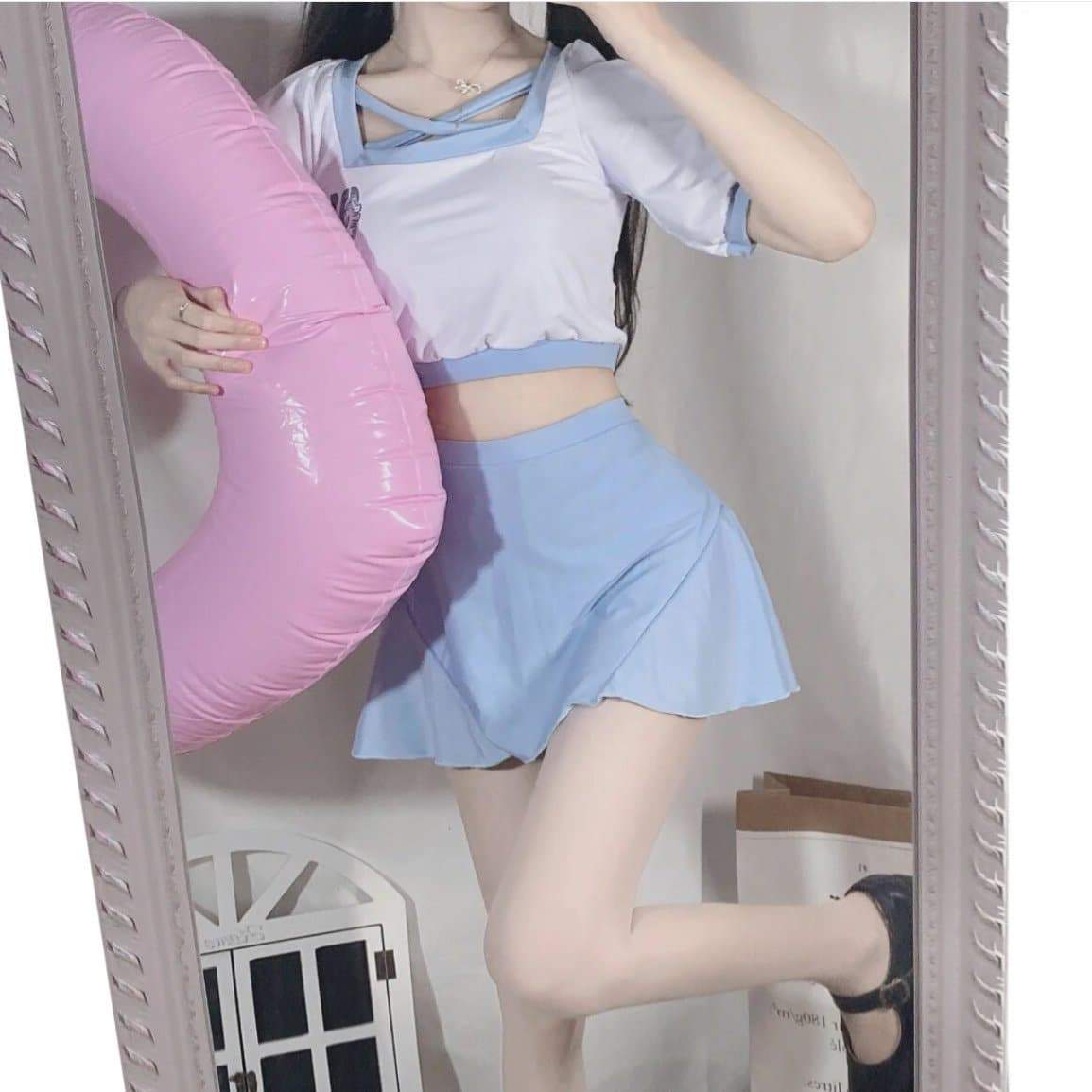 Lovely Blue Bear Print Swimsuit Top and Short Skirt Set SS2002