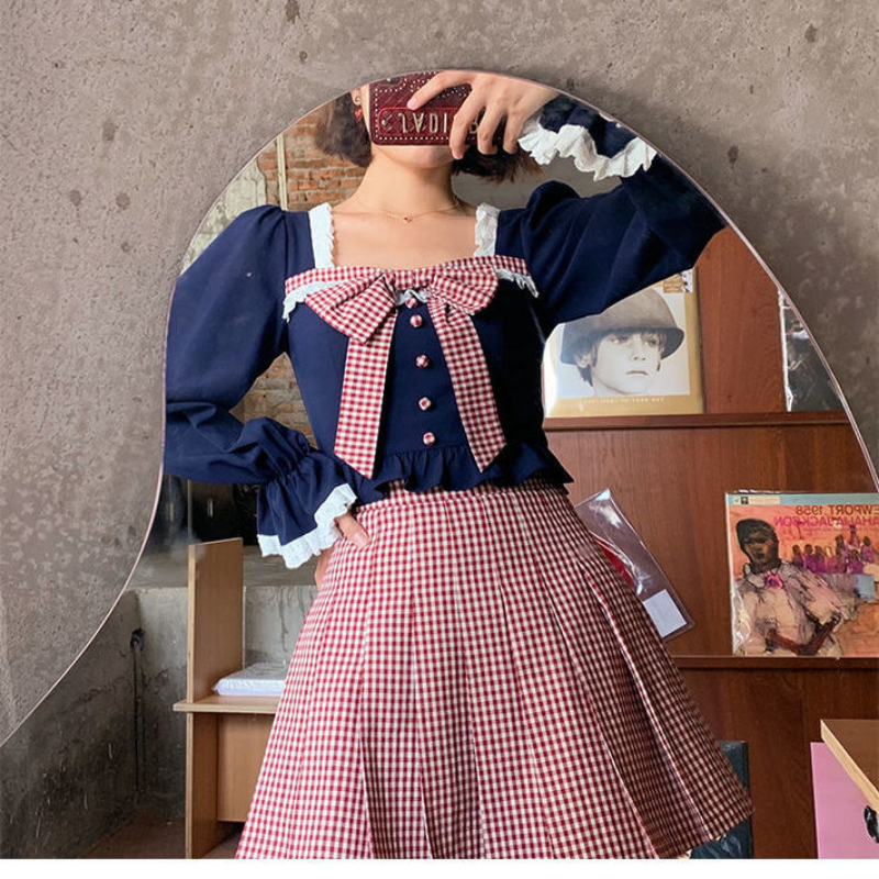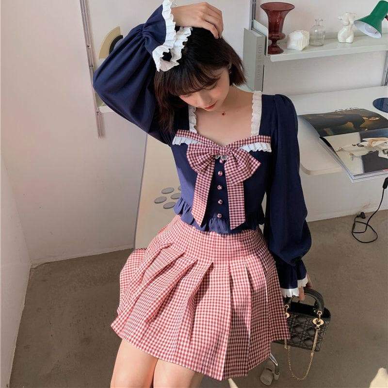 Cute Asian Fashion Plaid Pleated Skirt Sweet Korean Blue Bow Top Set SS1810