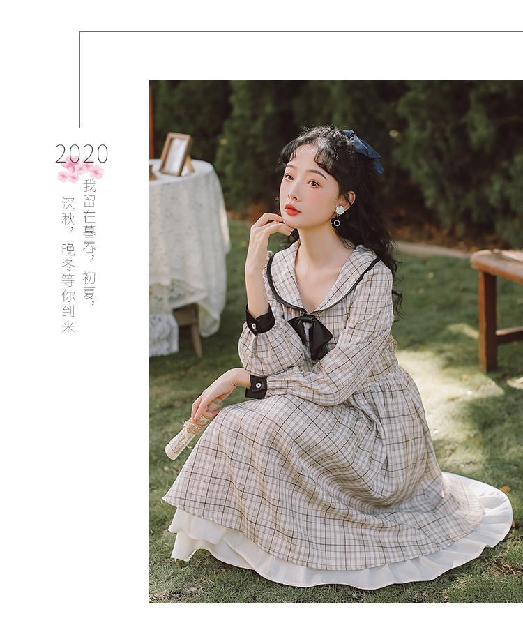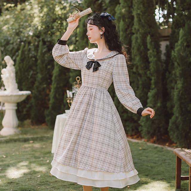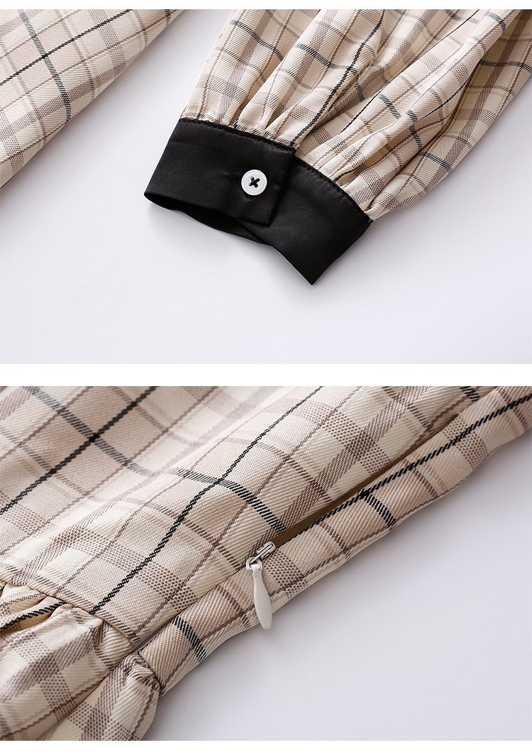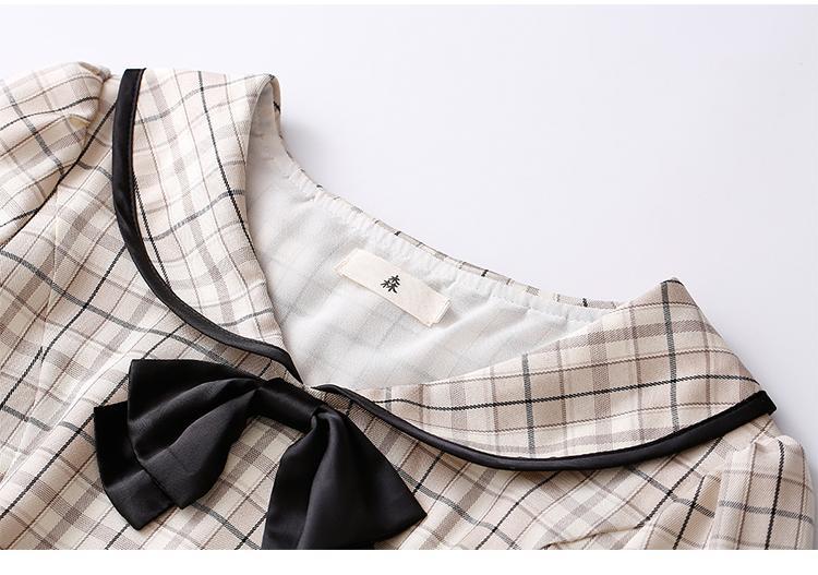 Plaid Vintage Style Midi Dress with Peter Pan Collar, long puff sleeves, black Bow.Made from checked fabric and has ahigh waist and floaty skirt to create movement as you walk.