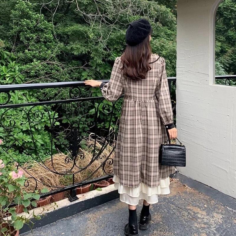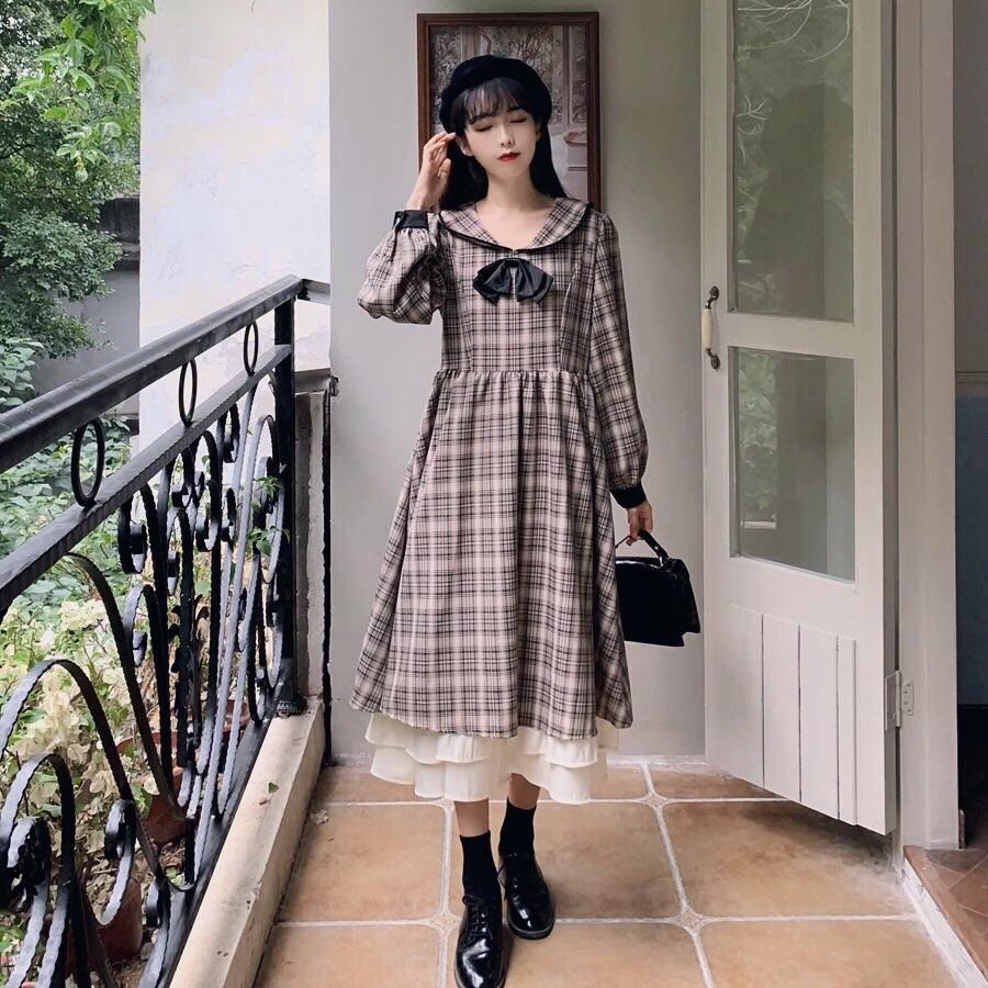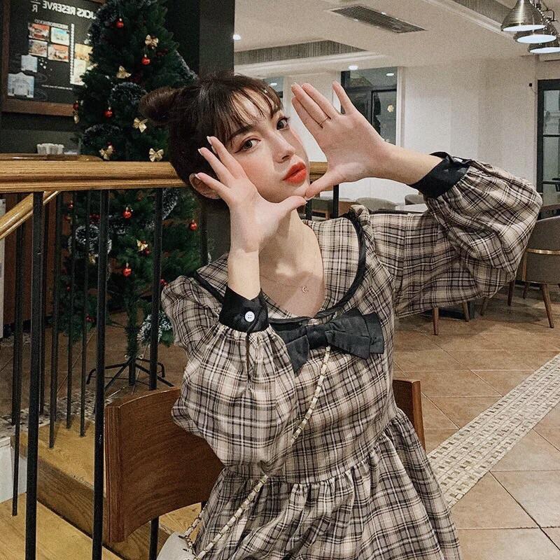 Plaid Vintage Style Midi Dress with Peter Pan Collar, long puff sleeves, black Bow.Made from checked fabric and has ahigh waist and floaty skirt to create movement as you walk.