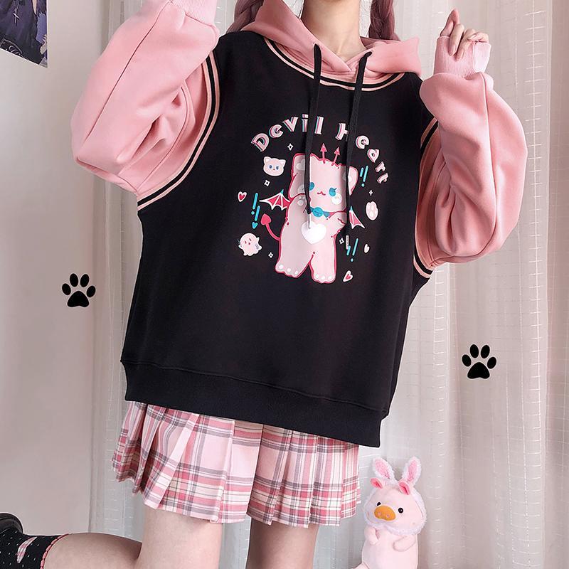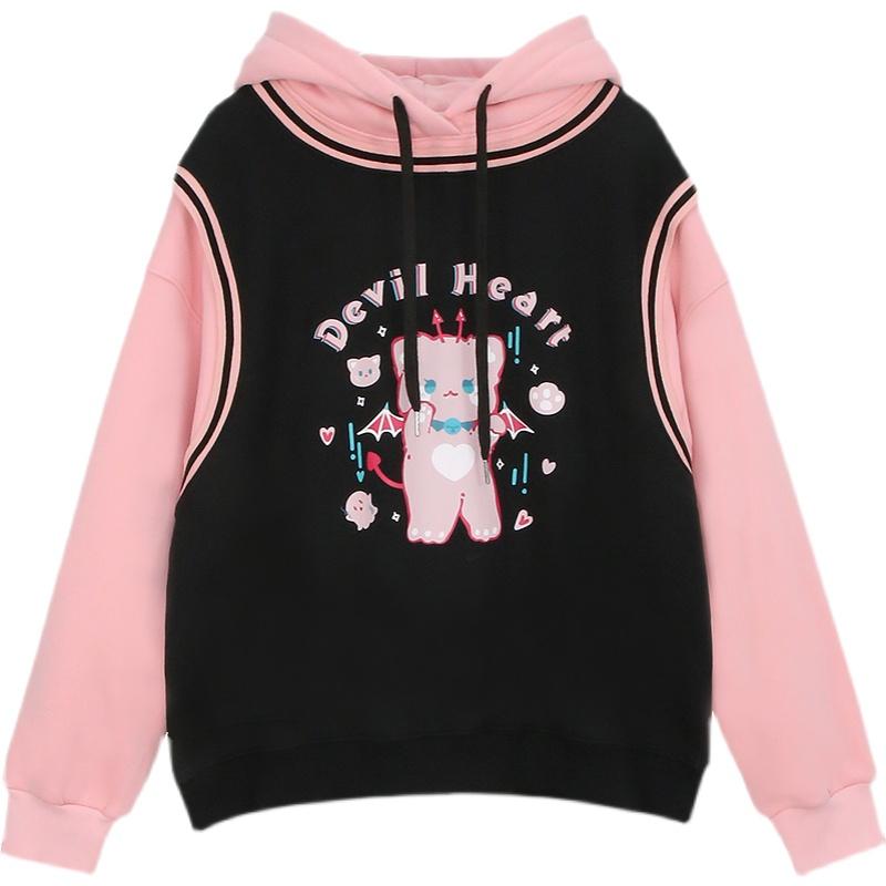 Kawaii Devil Heart Pink Bear Pastel Black Sweater SS2093