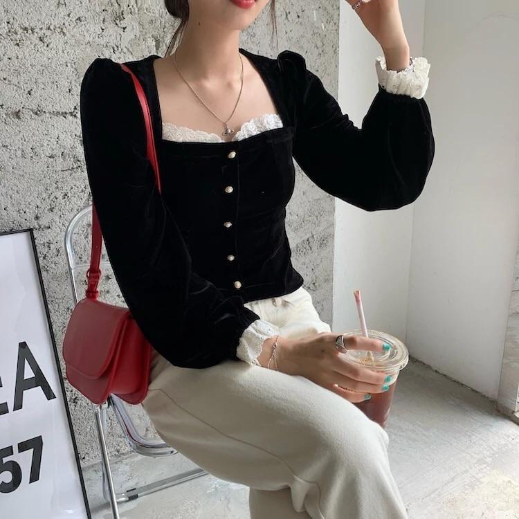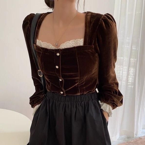 Vintage-Aesthetic Long Sleeve Elastic Velvet Top