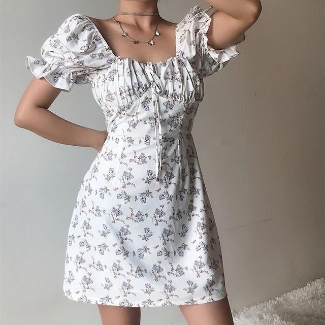 This Square Collared Vintage Aesthetic Floral Mini Dress has puff sleeves with a bow on it. The empire waistline will show off your figure and the slash neck will embrace your collar bones.