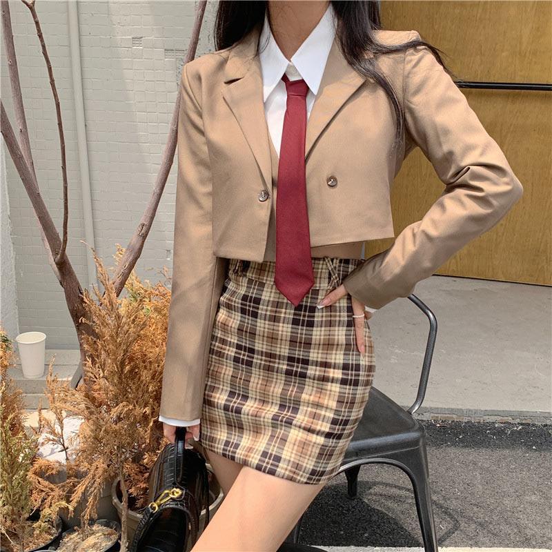 Korean High Waist Jacket White Shirt Pleated Skirt Tie Four Pieces DK845