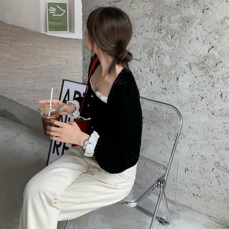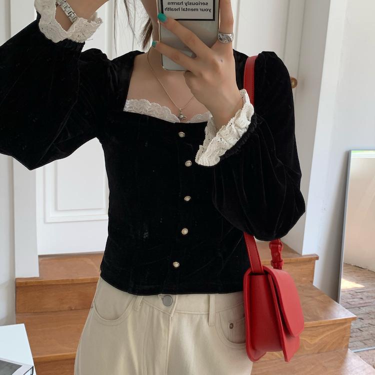 Vintage-Aesthetic Long Sleeve Elastic Velvet Top